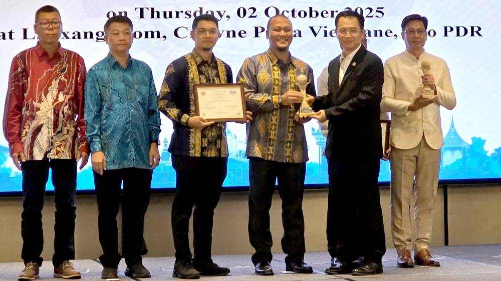 Menteri Industri & Perdagangan Laos PDR, H.E. Malaithong Kommasith (kedua kanan) menyerahkan penghargaan 1st Runner Up kategori Best Practices in Sustainable Mineral Development Mineral Mining (Non-Metallic) kepada Quarry Manager PT Solusi Bangun Andalas, Adi Handarbeni (ketiga kanan) pada ajang ASEAN Mineral Awards 2025 di Vientiane, Laos, pada awal Oktober 2025.