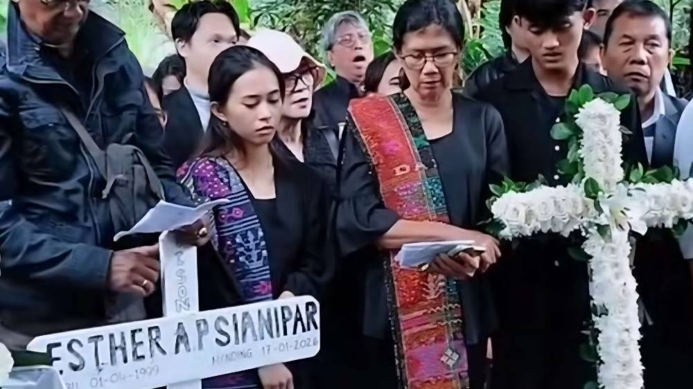 Kedua orang tua Esther tampak tak kuasa menahan tangis saat peti jenazah mulai diturunkan ke liang lahat. Isak haru keluarga dan kerabat mengiringi prosesi pemakaman hingga selesai.